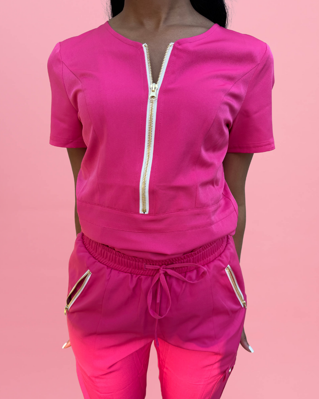 This scrubs top features a gold-centered zipper and pairs perfectly with our J Love Joggers.